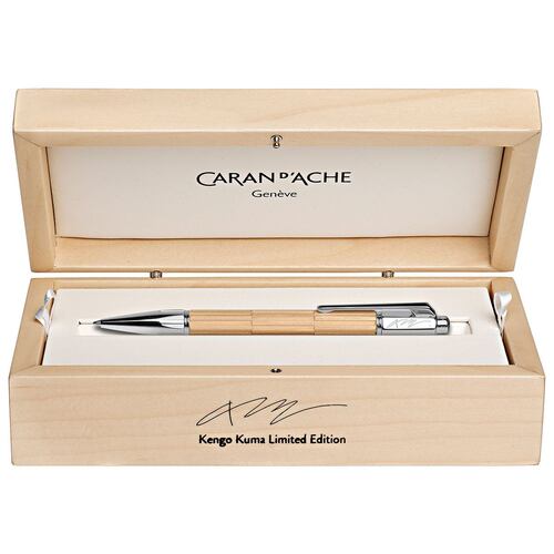 Colección Varius Kengo Kuma edición limitada a 100 piezas. Diseñada por uno de los arquitectos japoneses más importantes Kengo Kuma quien diseñó el estadio Olímpico de Tokio, para las Olimpiadas 2021. Con esta edición Caran d'Ache explora los código de la arquitectura tradicional japonesa con su estilo Chidori inspirados en los antiguos juguetes japoneses. Bolígrafo con cuerpo hexagonal de latón con baño de rodio e insertos de madera de ciprés Hinoki. Utiliza el cartucho Goliath viene en punto medio tinta negra. Disponible también en punto F y B tinta azul, roja y verde. La parte superior de la pluma tiene grabada la firma de Kengo Kuma. Estuche de madera haciendo juego con el color del cuerpo del bolígrafo.