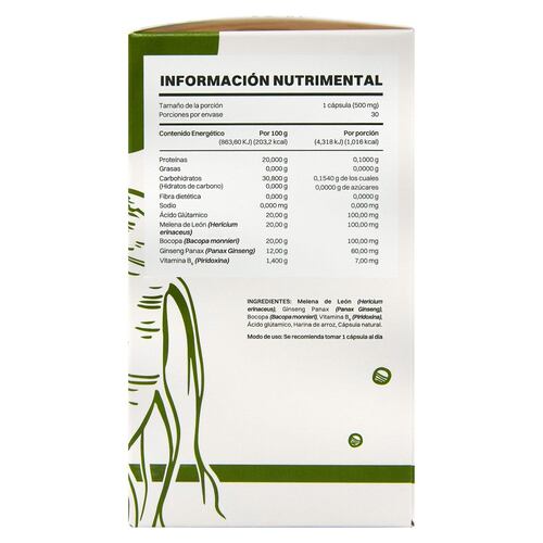 - sustancia áctiva"Melena de León (Hericum erinaceus) Bocopa (Bacopa monnieri) Ácido glútamico Ginseng panax Vitamina B6 (Piridoxina"