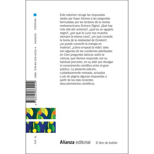 Este volumen recoge las respuestas dadas por Isaac Asimov a las preguntas formuladas por los lectores de la revista norteamericana Science Digest. ¿Qué hay más allá del universo?, ¿qué es un agujero negro?, ¿por qué la Luna nos muestra siempre la misma cara?, ¿en qué consiste la teoría de la relatividad de Einstein?, ¿se puede convertir la energía en materia?, ¿cómo empezó la vida? tales son algunas de las cuestiones planteadas en Cien preguntas básicas sobre la ciencia, que Asimov responde con su habitual precisión, en su afán por divulgar el conocimiento científico entre el gran público. La presente edición, cuidadosamente revisada, actualiza a pie de página algunas respuestas a partir de los más recientes descubrimientos científicos.