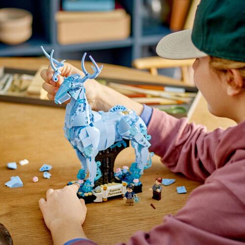 ¡Realiza el poderoso encantamiento Patronus para protegerte de los Dementores! Usa la varita de Harry Potter (y tus hechizantes habilidades de construcción) para crear un Patronus que adopte la forma de un ciervo. Colócalo en la base para exhibirlo junto con la minifigura de Harry Potter. Usa los mismos bricks para invocar al Patronus del Profesor Remus Lupin, un lobo, ¡y asombra a todos con tus capacidades mágicas de reconstrucción!