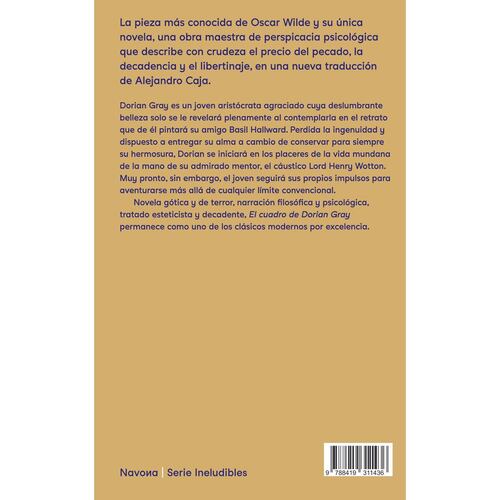 Dorian Gray es un joven aristócrata agraciado cuya deslumbrante belleza solo se le revelará plenamente al contemplarla en el retrato que de él pintará su amigo Basil Hallward. Perdida la ingenuidad y dispuesto a entregar su alma a cambio de conservar para siempre su hermosura, Dorian se iniciará en los placeres de la vida mundana de la mano de su admirado mentor, el cáustico Lord Henry Wotton. Muy pronto, sin embargo, el joven seguirá sus propios impulsos para aventurarse más allá de cualquier límite convencional. Novela gótica y de terror, narración filosófica y psicológica, tratado esteticista y decadente, El cuadro de Dorian Gray permanece como uno de los clásicos modernos por excelencia.