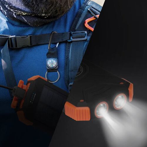 Este paquete de batería portátil no solo ofrece una gran capacidad de 10000 mAh, una plataforma de carga inalámbrica incorporada y 2 puertos USB de alta velocidad, sino que también cuenta con una brújula, una linterna LED y un panel solar incorporado para recarga de emergencia.