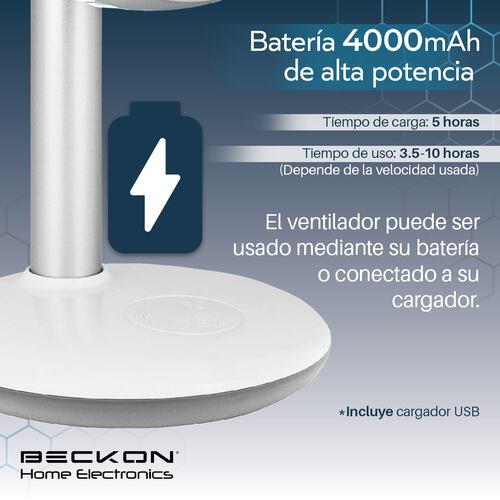 Refréscate con nuestro ventilador recargable con hasta 10 horas de uso, especial para todo tipo de actividades donde la conexión eléctrica no está disponible. El ventilador también puede ser conectado mediante su cable usb.