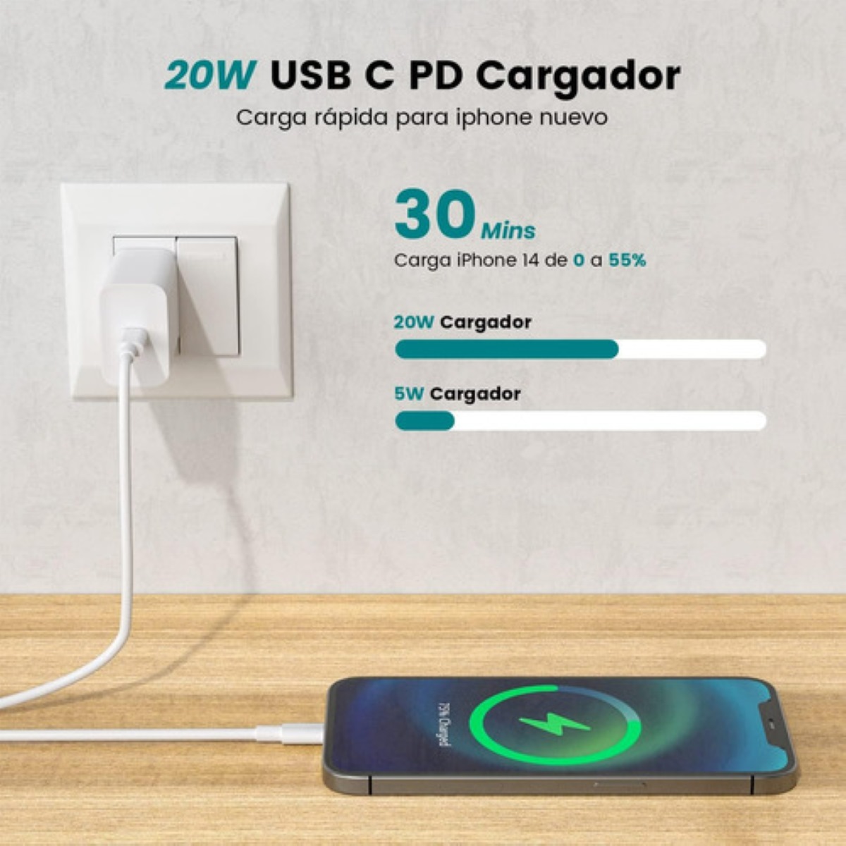 Cargador rápido para iPhone, cargador rápido para iPhone con enchufe de pared USB Type-C de 20 W, puerto USB C de carga rápida PD 3.0 proporciona una potencia máxima de salida de 20 W, solo tarda 30 minutos en cargarse tu iPhone 50%, te ahorra más de 1.5 horas.
