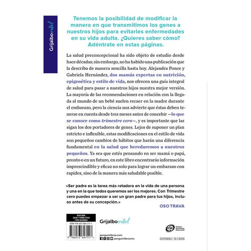 La salud preconcepcional ha sido objeto de estudio desde hace décadas sin embargo, no ha habido una publicación que la describa de manera sencilla hasta hoy. Alejandra Ponce y Gabriela Hernández, dos mamás expertas en nutrición, epigenética y estilo de vida, nos ofrecen una guía integral de salud para pasar a nuestros hijos nuestra mejor versión. La mayoría de las recomendaciones en relación con la llegada al mundo de un bebé suelen recaer en la madre durante el embarazo, pero la ciencia nos advierte que éstas deben tenerse en cuenta desde tres meses antes de concebir lo que se conoce como trimestre cero, y es importante que las sigan los dos portadores de genes. Lejos de suponer un plan estricto e inflexible, estas modificaciones en el estilo de vida son pequeños cambios de hábitos que harán una diferencia fundamental en la salud que heredaremos a nuestros pequeños. Ya sea que estés pensando en ser mamá o papá, pronto o en un futuro, en este libro encontrarás información imprescindible y eficaz no solo para lograr un embarazo con rapidez, sino de la manera más saludable posible. Ser padre es la tarea más retadora en la vida de una persona y una en la que todos queremos ser los mejores. Con Trimestre cero puedes empezar a ser un gran padre para tus hijos, incluso antes de su concepción. -OSO TRAVA
