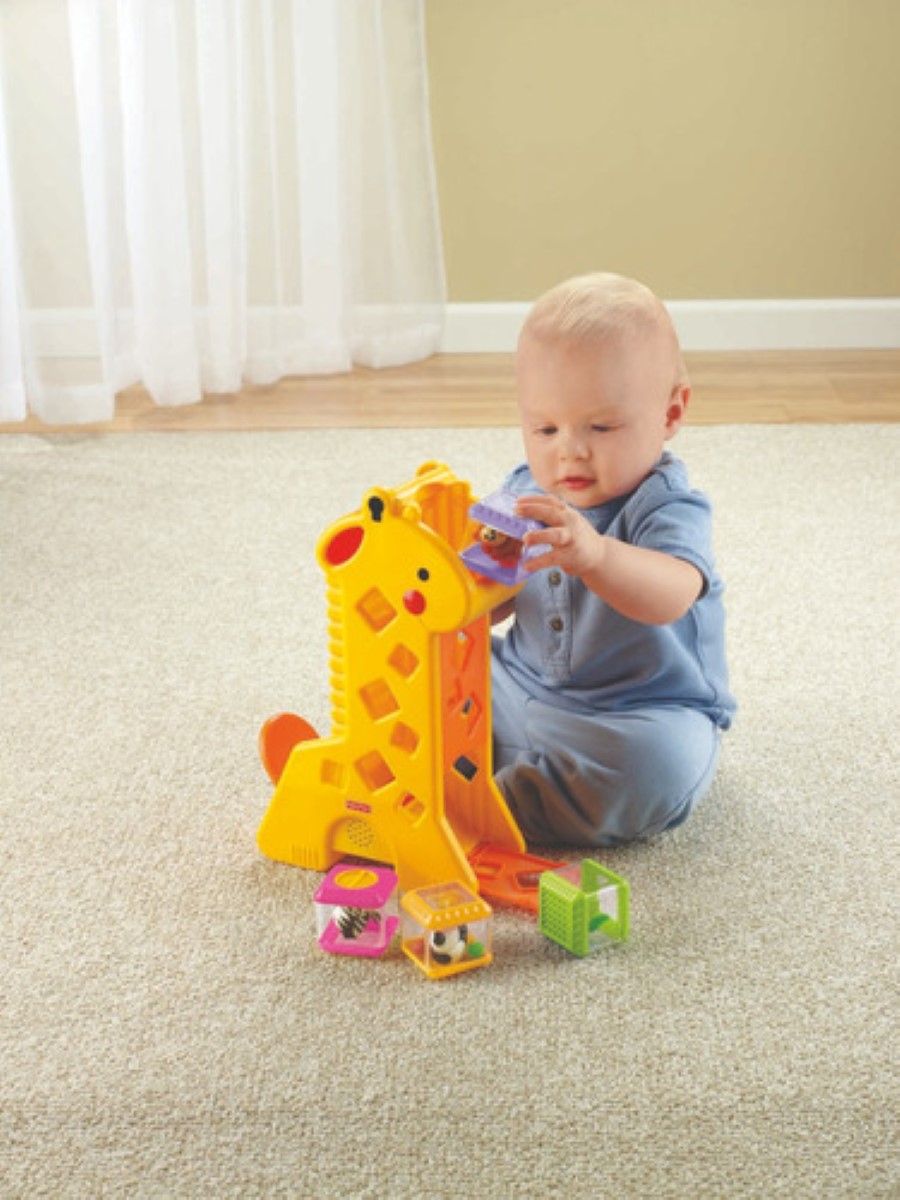 ¡Vive risas interminables y diviértete con el juguete interactivo Jirafa Peek-A-Blocks de Fisher Price®! Tu pequeño puede apilar los bloques o dejarlos caer, lo que activará sonidos y canciones divertidas. Cada bloque incluye un animalito diferente y actividades interactivas para que tu bebé explore. ¡Así la diversión y el aprendizaje pueden continuar todo el día! Donde el desarrollo entra en juego. Habilidades sensoriales: colores brillantes, animalitos amistosos y sonidos divertidos estimulan el desarrollo visual y auditivo de tu bebé. Motricidad fina: las pequeñas manos de tu pequeño estarán ocupadas cuando tomen, apilen y coloquen los bloques, lo que ayudará a fortalecer su coordinación manos-ojos. Curiosidad y asombro: colocar cada bloque dentro de la jirafa activa la música y los sonidos, lo que le presenta a tu pequeño el concepto de causa y efecto.