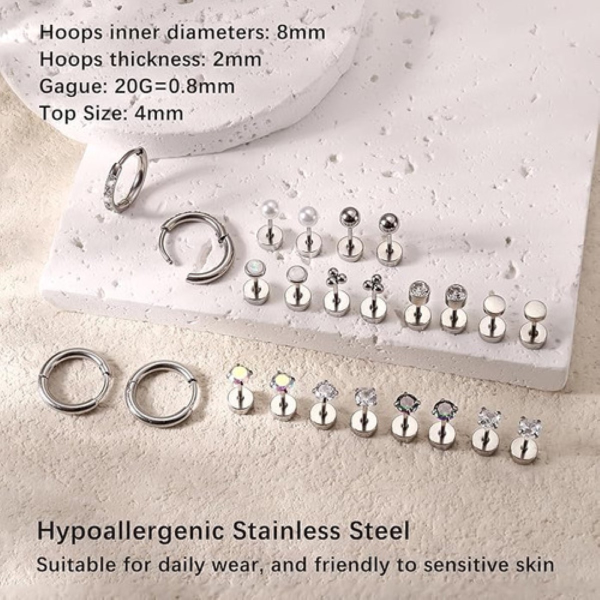 12pare Piercing Arete Oreja Cartílago Mujer Acero Inoxidable PLATA