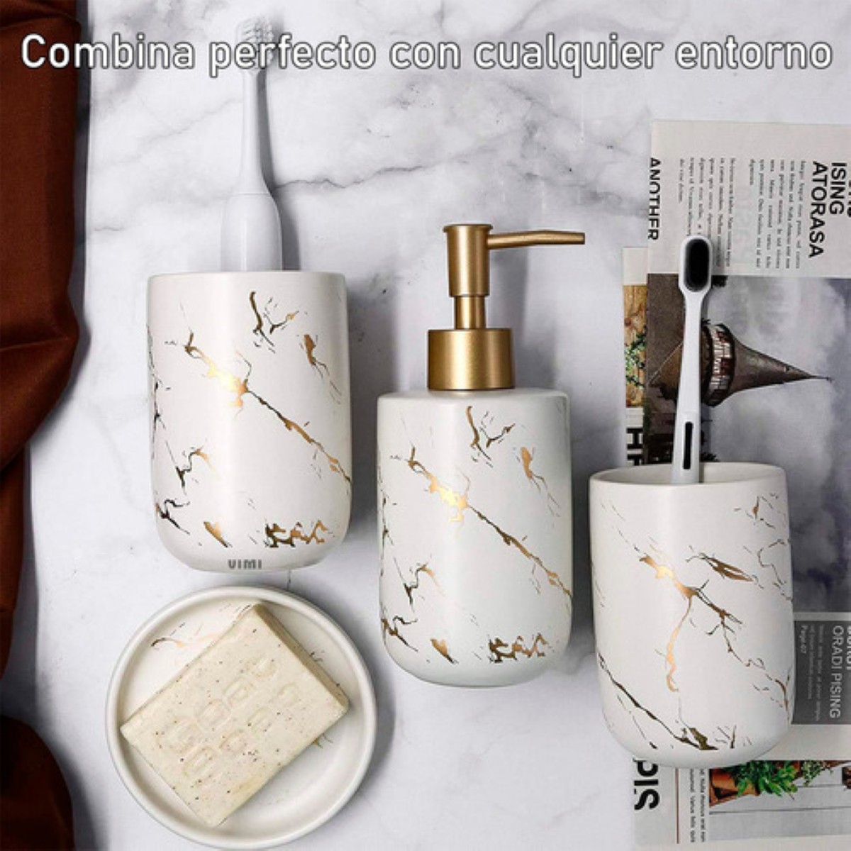 Dale un toque de lujo a tu baño con este set de accesorios que combina funcionalidad y estilo. Perfecto como regalo o para renovar tu espacio.